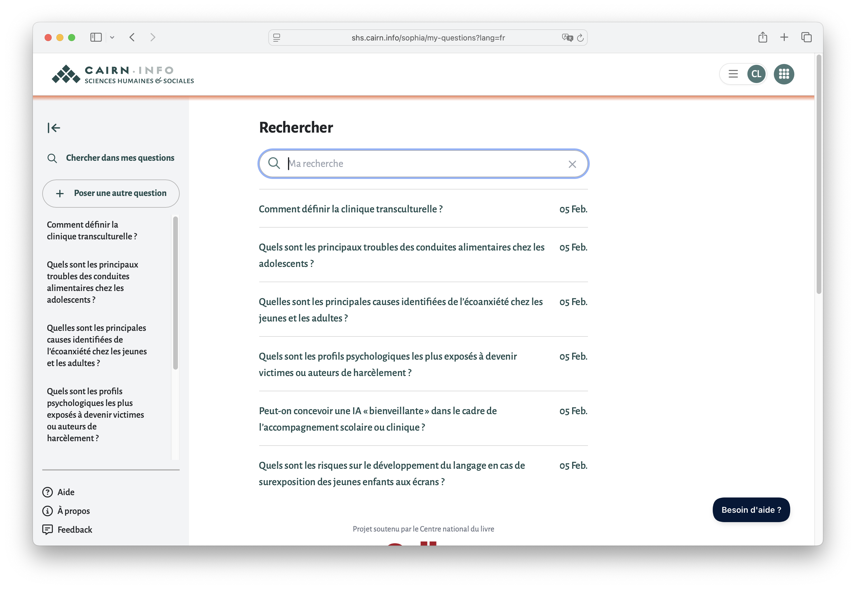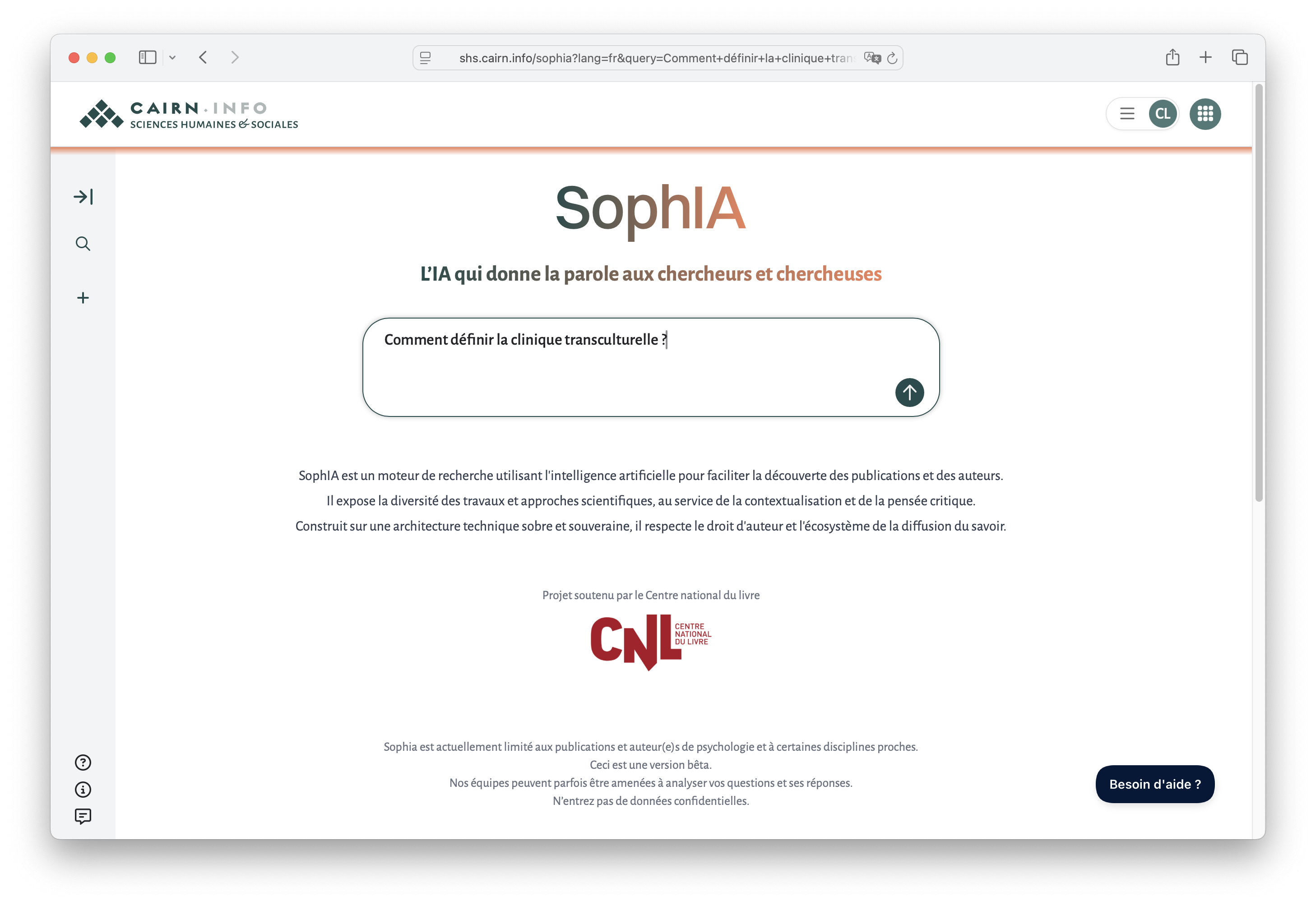Porté par Cairn.info avec le soutien du CNL et en partenariat avec Kairntech, SophIA est un moteur de recherche utilisant l'intelligence artificielle pour faciliter la découverte des publications et des auteurs.