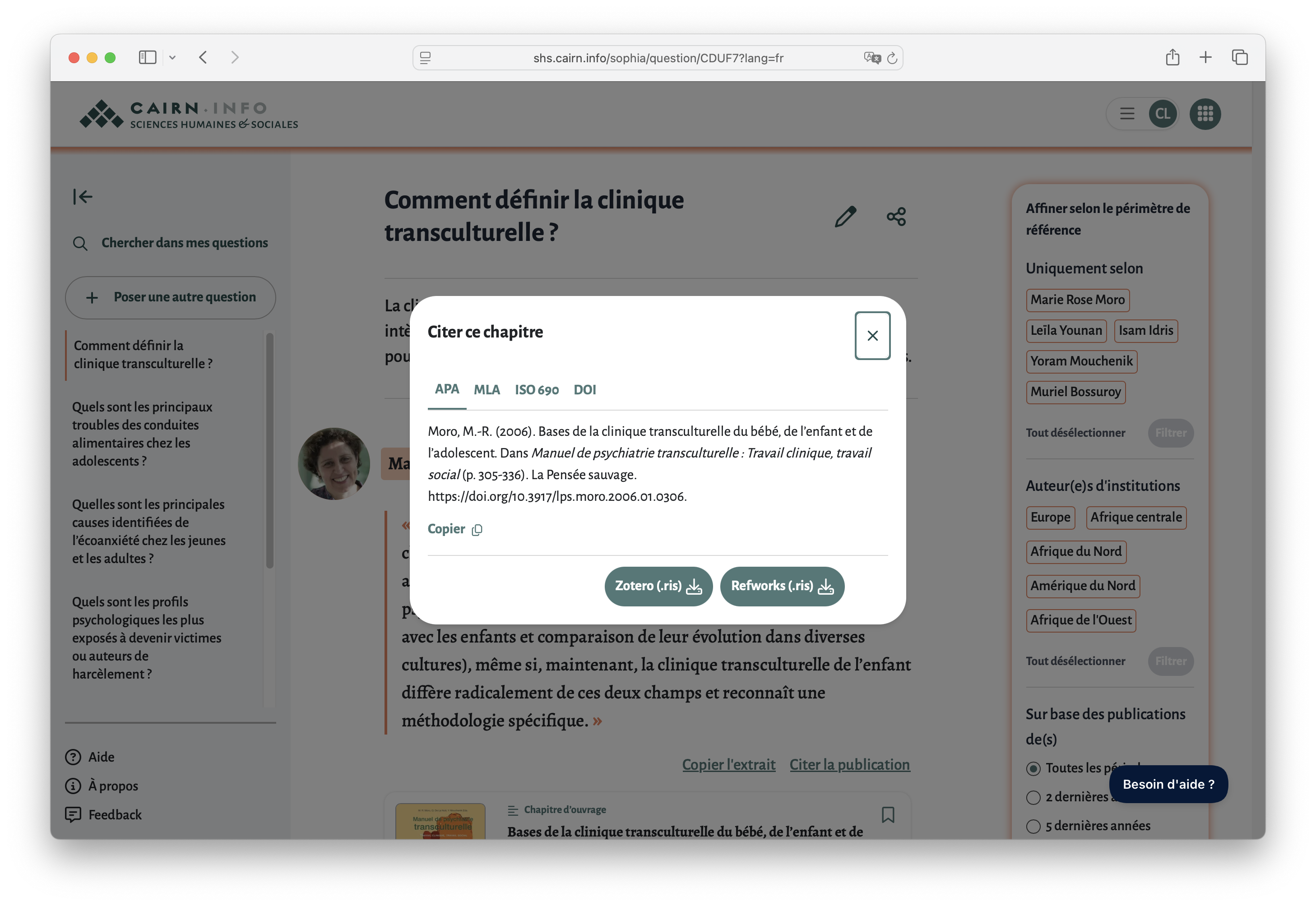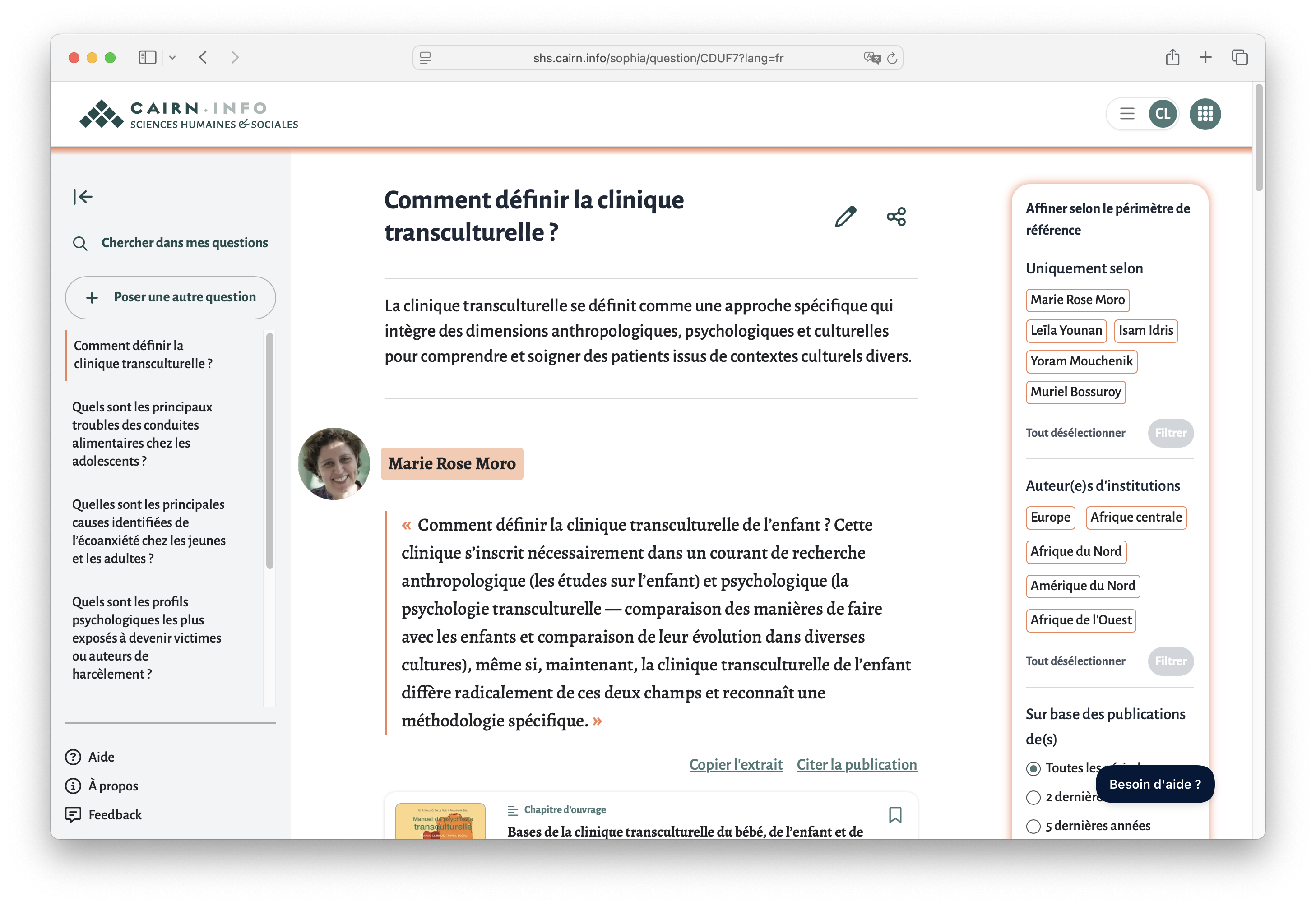 Conçu comme un produit exemplaire et évolutif, SophIA ne se limite pas à un simple questionnement transversal du corpus. Le service est pensé pour permettre à l’utilisateur de partir d’un contexte éditorial précis ou de restreindre ses recherches selon différents points d’entrée natifs de Cairn.info, notamment :